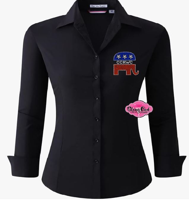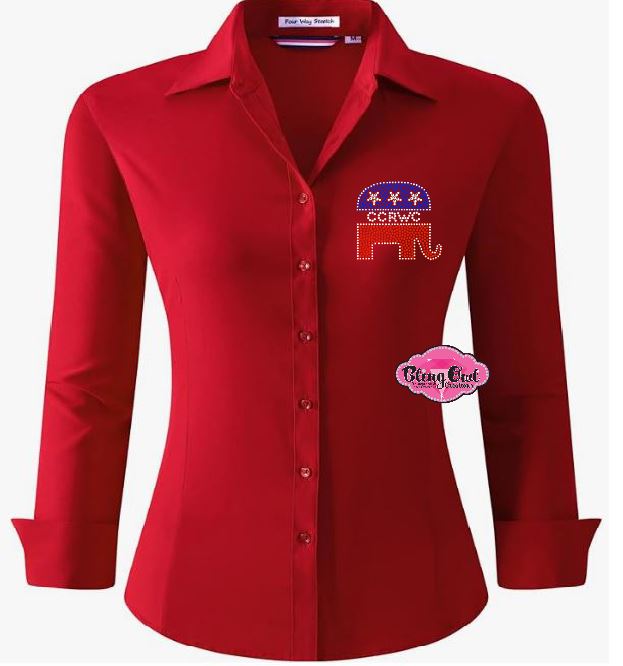 Limited Time Only - Show your pride in the CCRWC Organization and Republican party with our Dress Shirt to to wear to events, meetings or rallies. This shirt features a stunning elephant pocket size design bedazzled with sparkling rhinestones, making it the perfect statement piece for the upcoming elections. Stand out at any local government event and support your party in style.