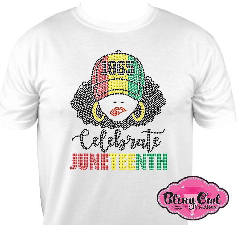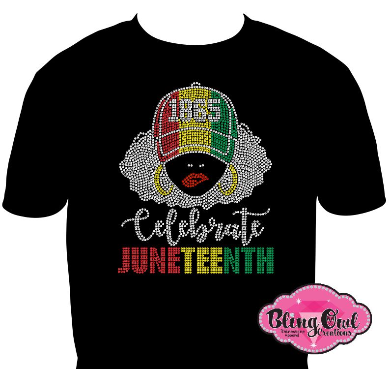 Shine bright and honor freedom with our bold Celebrate Juneteenth Rhinestone Shirt! Featuring a powerful afro lady design wearing a red, yellow, and green cap with "1865" across the front, this sparkling tee brings the story of liberation to life. The word “Celebrate” is written in radiant script, while “JUNETEENTH” pops in Pan-African colors—made entirely from top-quality glass rhinestones that shimmer with every movement.