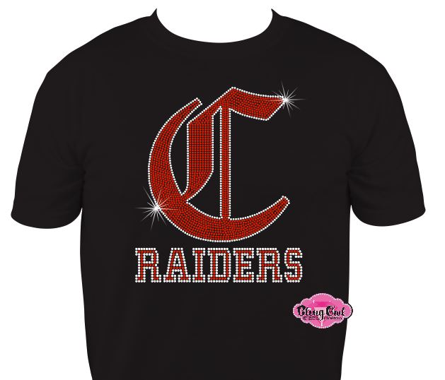 Show off your Raider pride with bold sparkle! This Currituck C Raiders Rhinestone Tee is handcrafted with premium glass rhinestones that catch the light and shine bright at every game, pep rally, or casual outing. Featuring the striking Currituck “C” logo in red rhinestones with "Raiders" detailed underneath, this tee is the perfect way to support your team in style.