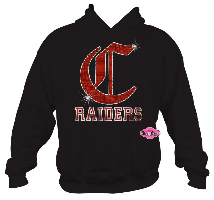 Show off your Currituck Raider pride with this bold rhinestone crewneck! Featuring the classic Currituck “C” and Raiders spelled out in sparkling red and crystal rhinestones, this sweatshirt is perfect for students, parents, and fans who want to shine on game day. Each piece is handcrafted with top-quality glass rhinestones for maximum sparkle and durability.