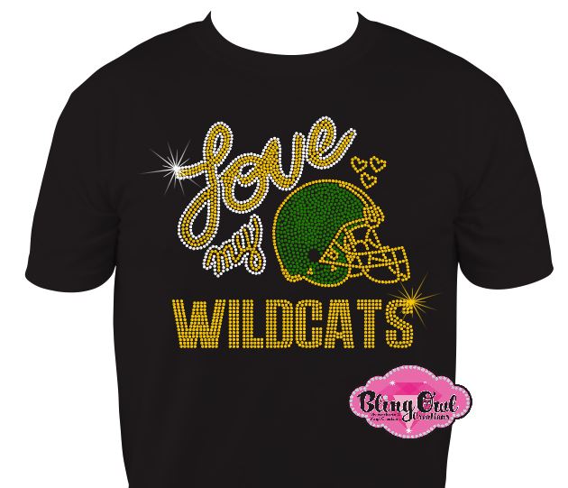Show your team pride in ultimate sparkle with our Love My Wildcats Rhinestone Tee! This unisex short sleeve shirt is made with premium Next Level fabric for comfort and durability, perfect for game days, school events, or casual wear. The design features dazzling, high-quality glass rhinestones in green, gold, and crystal to highlight the Wildcats football helmet and bold “Love My Wildcats” lettering. Each stone is meticulously hand-placed for maximum shine that won’t fade. Whether cheering from the sidelines or showing spirit around town, this tee delivers standout sparkle and lasting team pride.