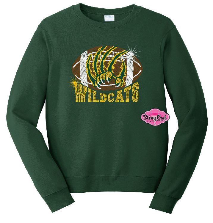 Show your team pride in style with our Wildcats Football Scratch Crewneck, featuring a bold rhinestone design that shines on and off the field! This unisex Port & Company crewneck sweatshirt delivers both comfort and sparkle with top-quality glass rhinestones arranged into a fierce football claw scratch design. Perfect for game days, school spirit events, or casual everyday wear, this sweatshirt keeps you cozy while making a statement. Each piece is handcrafted for long-lasting sparkle and durability, giving you that signature Bling Owl Creations shine. Pair it with jeans, leggings, or joggers for the ultimate game-day look.