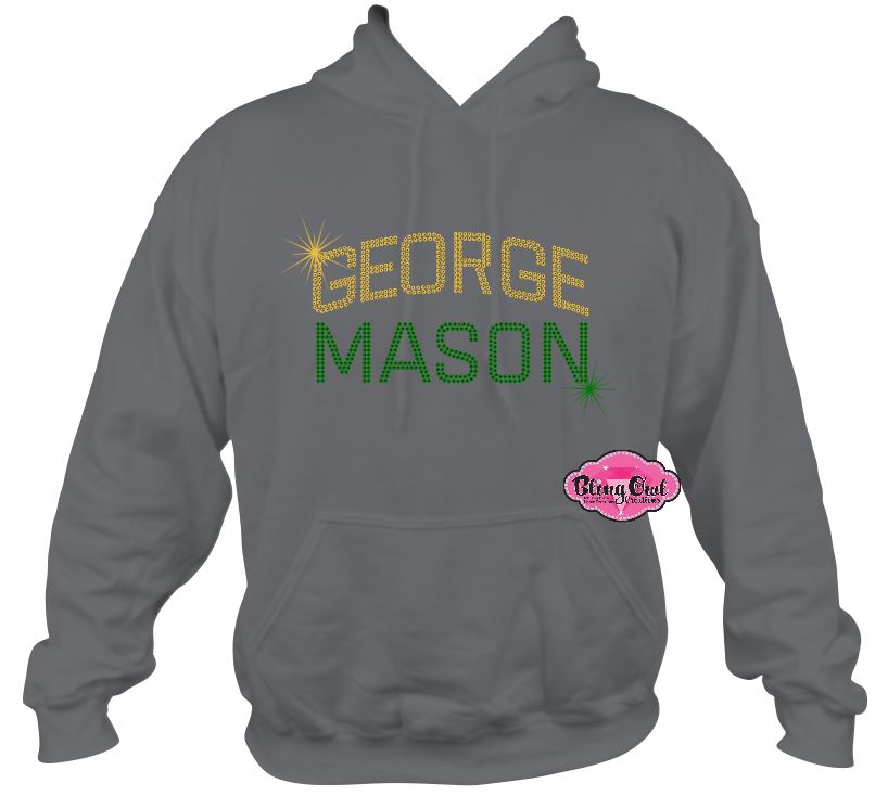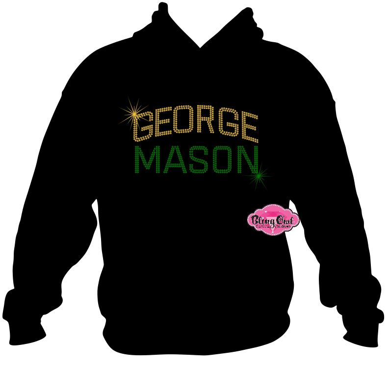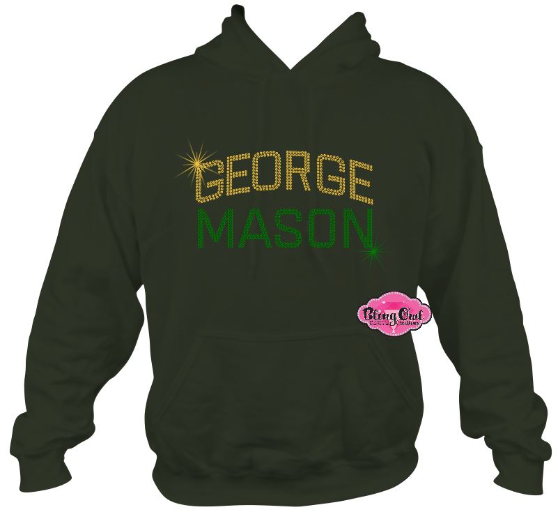 Show your Patriot pride in sparkling style with this officially licensed George Mason University bling sweatshirt! Featuring an arched "GEORGE MASON" design made with top-quality glass rhinestones in gold and green, this unisex hoodie is a game day must-have. Whether you're tailgating, heading to class, or repping your alma mater, this cozy sweatshirt brings both warmth and wow factor.