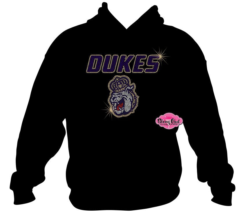 Shine with Duke pride in this officially licensed James Madison University rhinestone sweatshirt! Featuring the bold "DUKES" text and iconic Duke Dog face in dazzling top-quality glass rhinestones, this design is sure to turn heads on game day, alumni events, or casual wear.