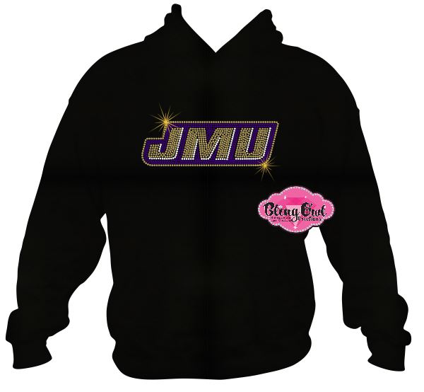 Show off your Duke pride in sparkling style with our officially licensed James Madison University bling logo sweatshirt! This cozy and eye-catching hoodie features the bold “JMU” athletic logo meticulously handcrafted with top-quality glass rhinestones that shimmer with every move.