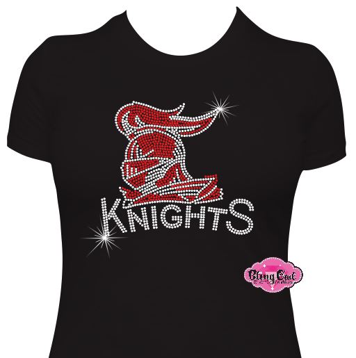 Design: Side view Knights helmet in red & white rhinestones with “KNIGHTS” text