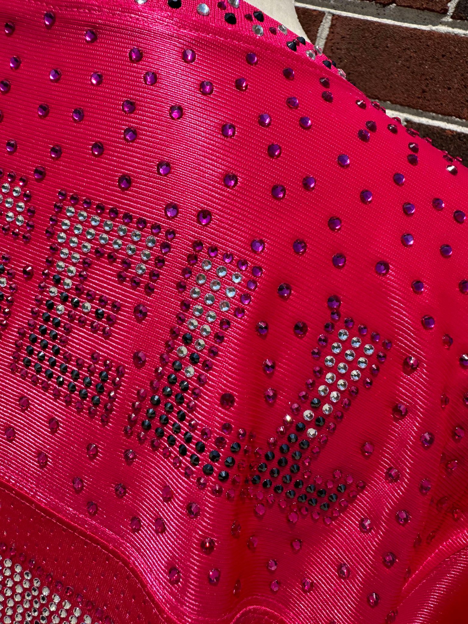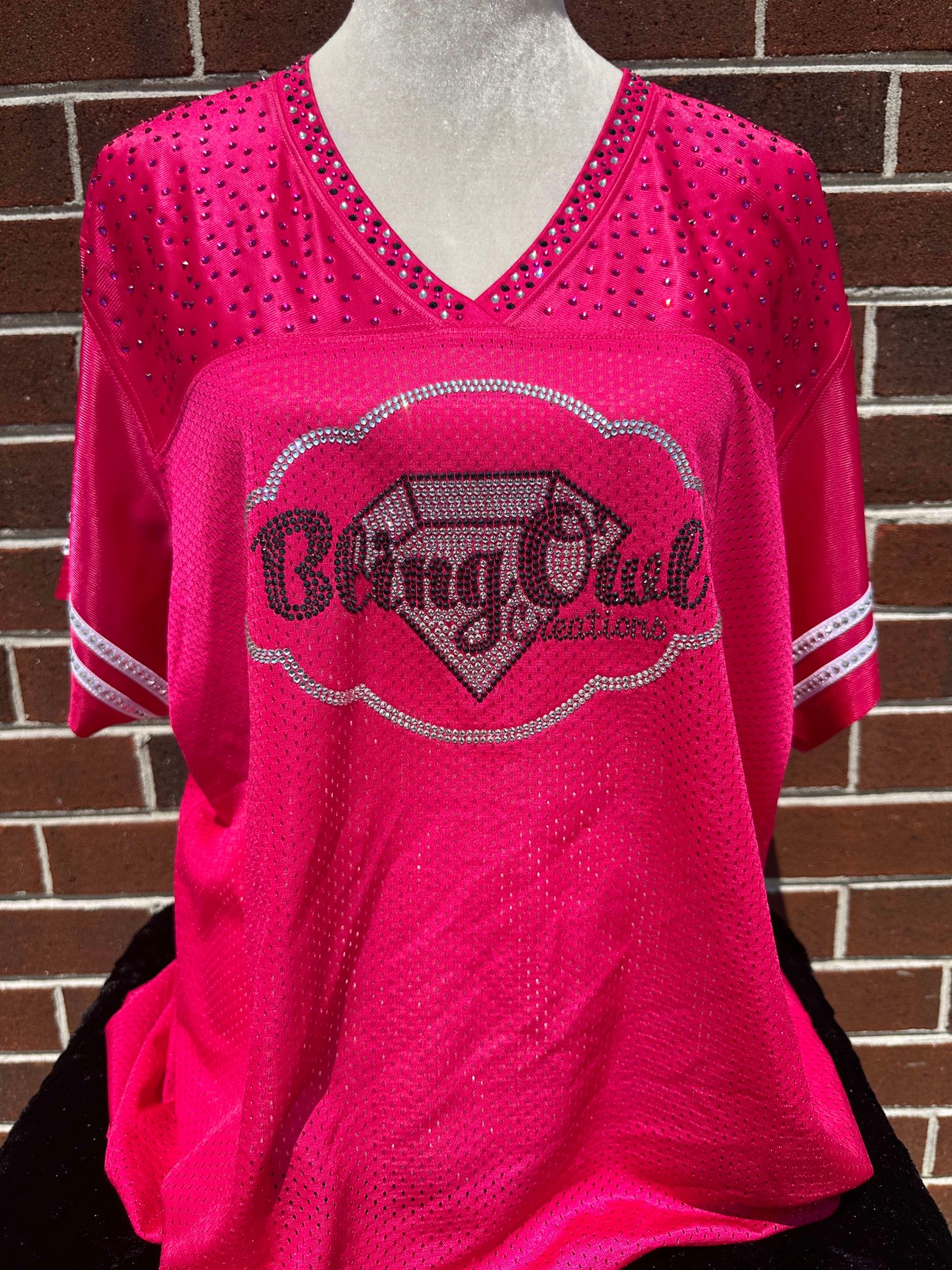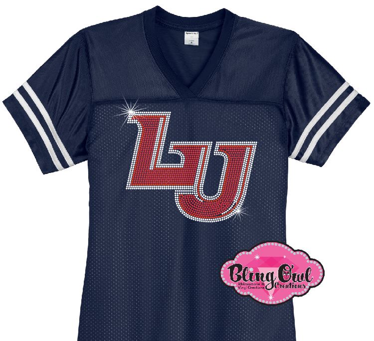 Stay stylish and show your school spirit with our Liberty University Football Bling Jersey. Our custom designed jersey features sparkling rhinestones that will make you stand out in the crowd. Perfect for game day or any occasion, this jersey is a must-have for any Liberty University fan. Available in a Variety of Colors.