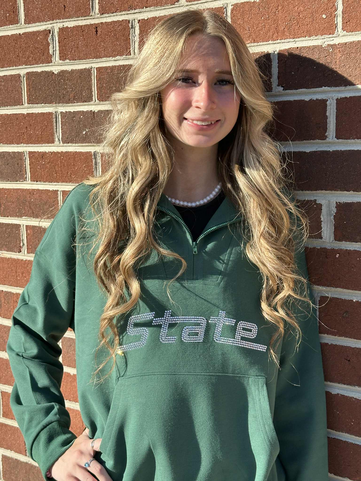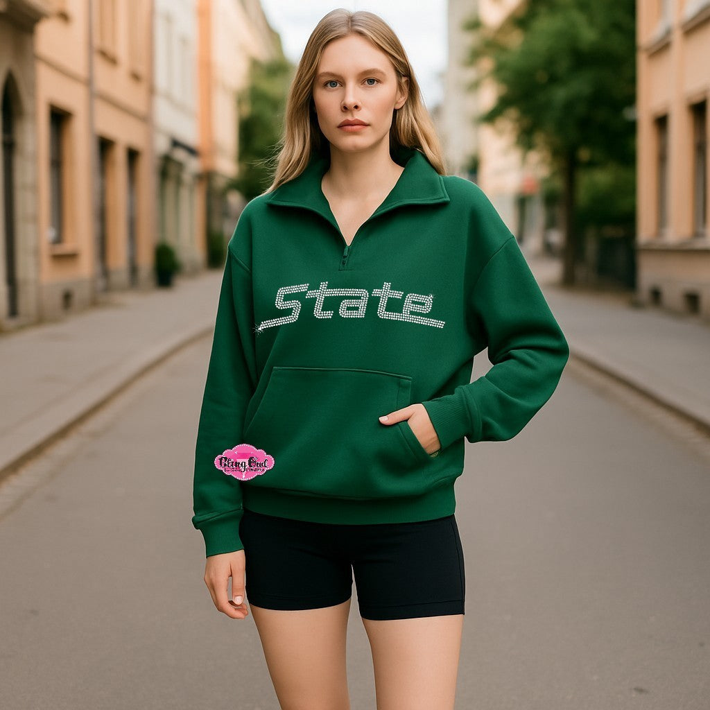 Crafted on a rich forest green premium fleece, this sweatshirt features the word “State” beautifully arched across the front in dazzling, precision-placed rhinestones. The glittering design is both durable and stylish—ensuring you shine bright all season long without sacrificing comfort.
