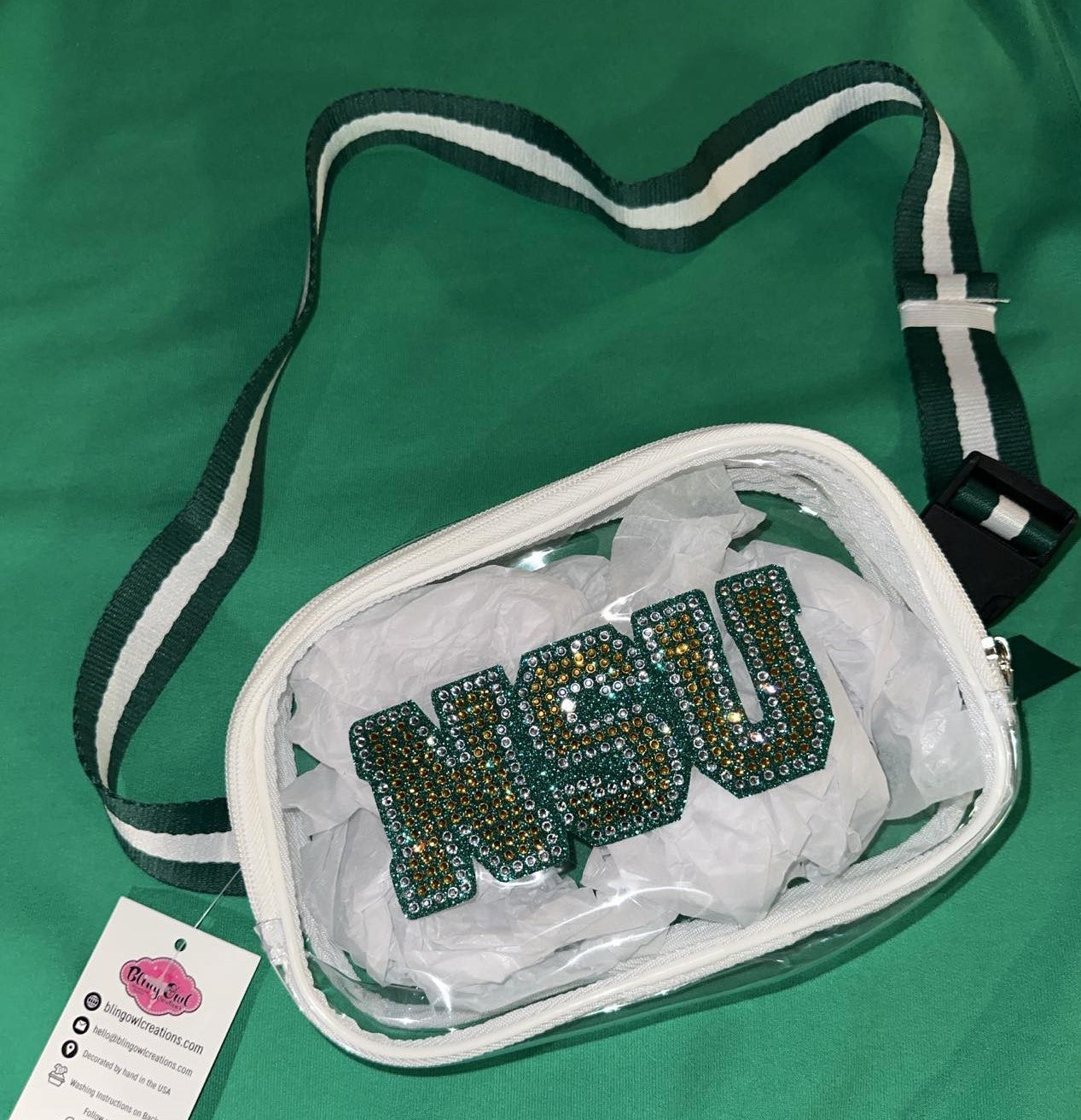 These beautiful Glitter/Rhinestone Decals are a perfect accent to your Car, Laptop, Mirror or anywhere you want to add some sparkle to. We use these decals on our Clear Stadium Purses.