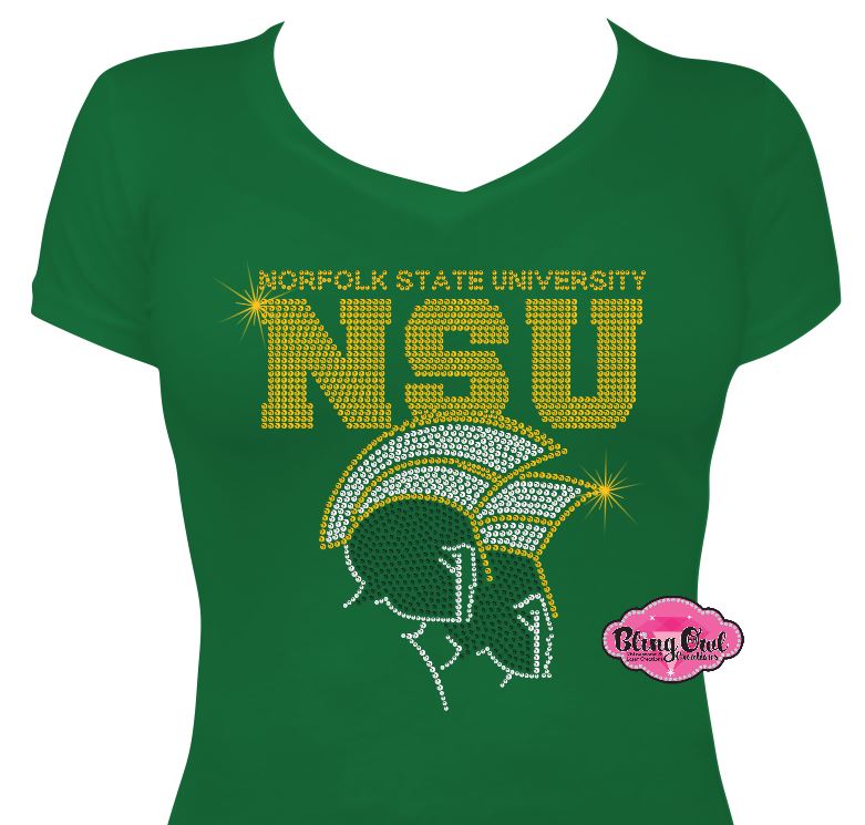 Show your Spartan pride in style with this dazzling NSU Scoop VNeck Womens Cut T-Shirt, handcrafted for Norfolk State University supporters who love to shine. Featuring the bold "NSU" block letters and Spartan head in vibrant green, gold, silver, and crystal-clear rhinestones, this black Vneck neck tee adds sparkle to your game day, alumni events, or everyday wear. Made with premium quality cotton and designed with a flattering silhouette, it’s both comfortable and eye-catching.