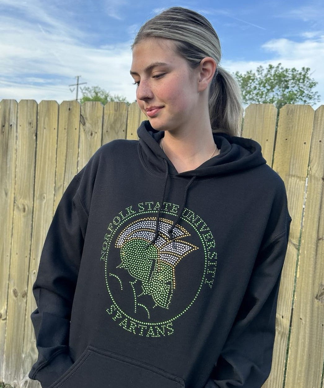 Show your Spartan pride in serious style with our Norfolk State University Spartans Bling Hoodie! This cozy hoodie features a stunning full-front circle logo design made entirely from top-quality glass rhinestones for maximum sparkle and durability. The dazzling Spartan helmet stands out in emerald, white, and gold crystals—custom-placed by hand for a high-end, boutique finish.