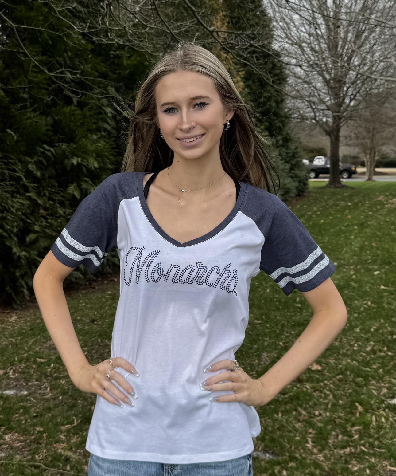 Cheer on the Monarchs in style with this Women’s Fitted Game Day Tee, designed to keep you comfortable while sparkling under the stadium lights. Featuring a flattering Vneck and athletic sleeve stripes, this tee blends sporty vibes with a touch of glam. Across the chest, “Monarchs” shines brilliantly in premium glass rhinestones—each hand-set for maximum sparkle and durability. Perfect for game days, alumni events, or casual wear, this tee pairs easily with jeans, shorts, or your favorite game day accessories.