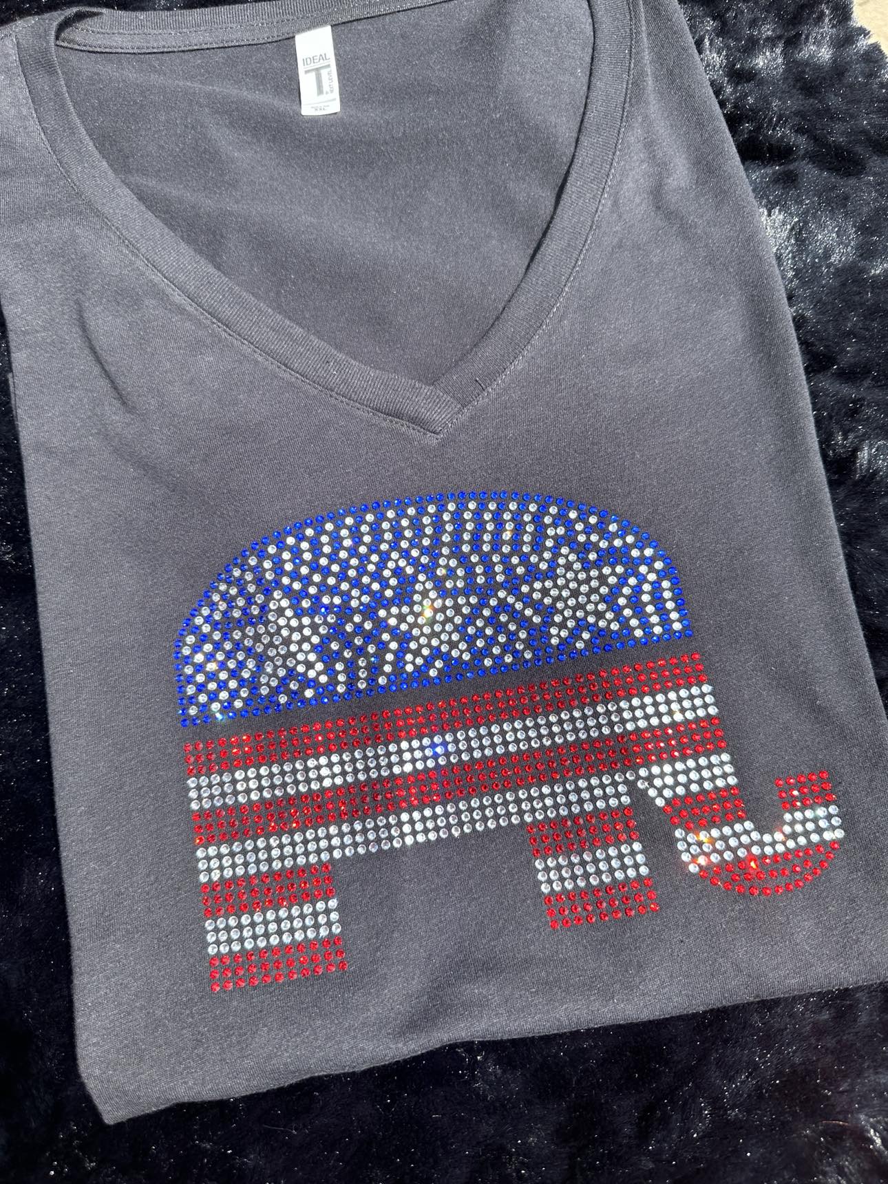 "Show your pride in the Republican party with our Republican shirt. This shirt features a stunning elephant design bedazzled with sparkling rhinestones, making it the perfect statement piece for the upcoming elections. Stand out at any local government event and support your party in style."