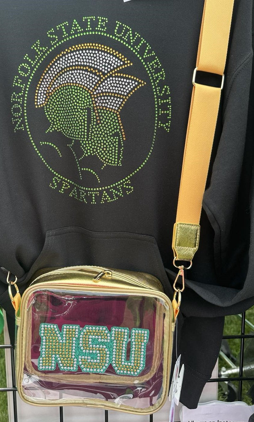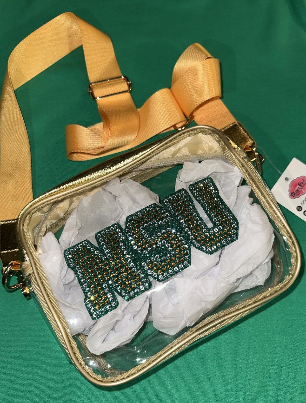 Turn heads on game day with this stylish and stadium-approved Gold NSU Clear Crossbody Purse! Designed for Norfolk State University fans who love to sparkle, this chic purse features a transparent body adorned with a bold, blinged-out NSU decal made from high-quality glass rhinestones in green and gold hues.