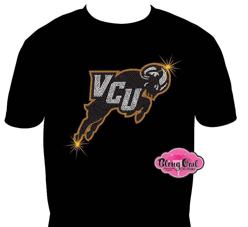 Show off your Ram pride in serious style with our VCU Jumping Ram Rhinestone Tee! This officially licensed design features a bold, leaping Ram with “VCU” across the body—brought to life in high-quality crystal-clear and gold rhinestones for maximum sparkle. Precision-placed stones ensure lasting shine and comfort, whether you're tailgating, cheering courtside, or repping VCU on campus.