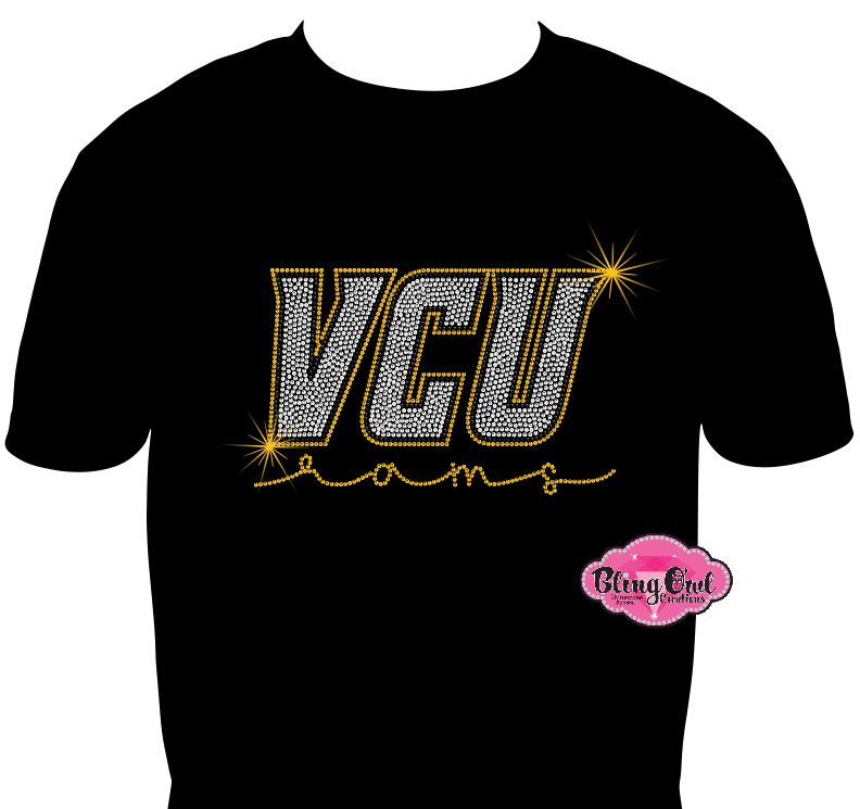 The large “VCU” across the chest is brought to life with over 1,500 premium-quality crystal rhinestones in crystal, black and gold, carefully hand-placed for a dazzling, high-impact look. Below, the word “rams” glides across in a glittering cursive-style gold rhinestone script, adding a touch of elegance to your school spirit.