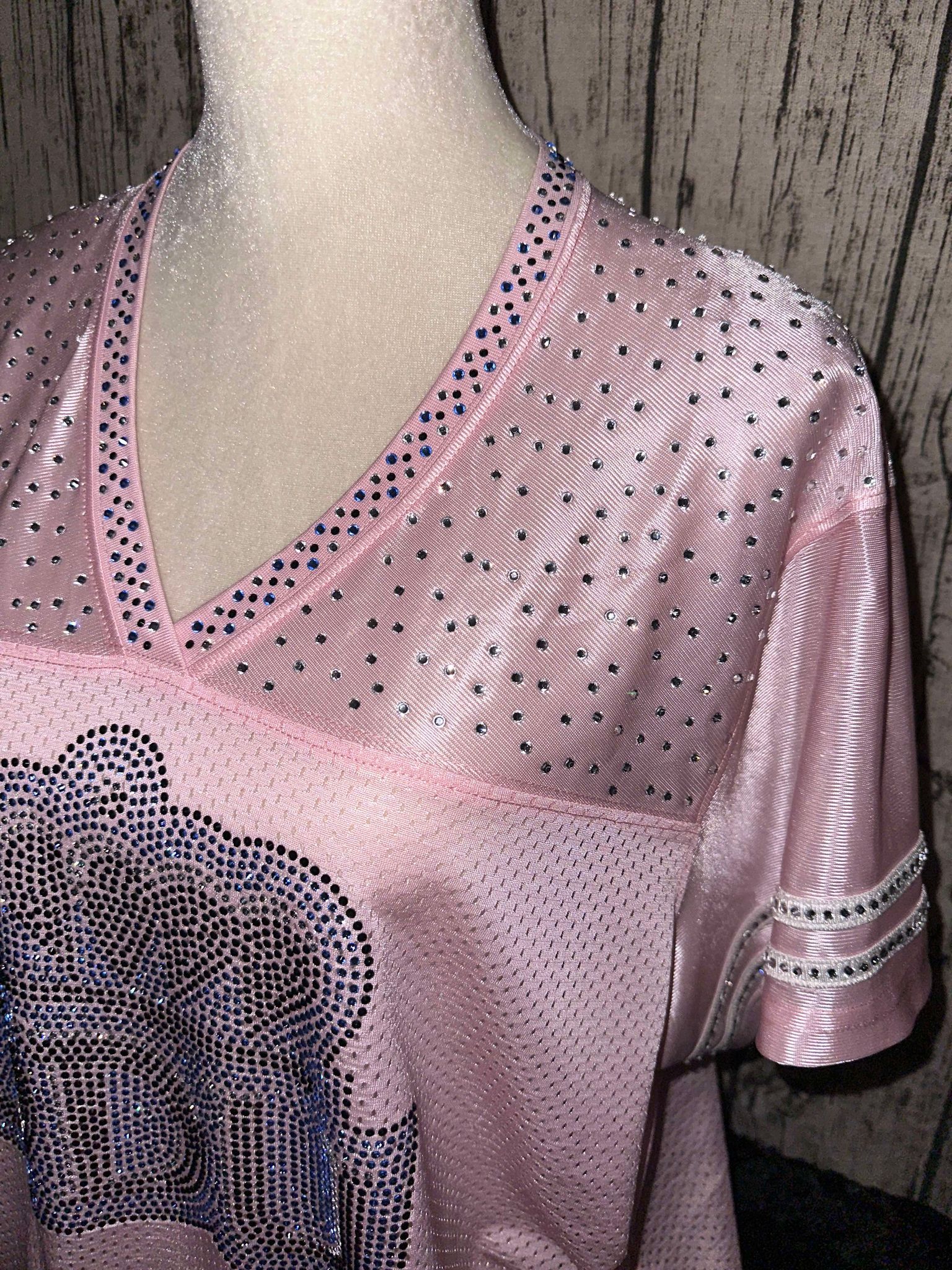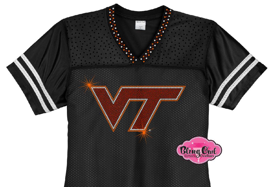 Stay stylish and show your school spirit with our VT Football Bling Jersey. Our custom designed jersey features sparkling rhinestones that will make you stand out in the crowd. Perfect for game day or any occasion, this jersey is a must-have for any Virginia Tech VT University fan. Available in a Variety of Colors. Colors will be changed based on your Jersey Color chosen.