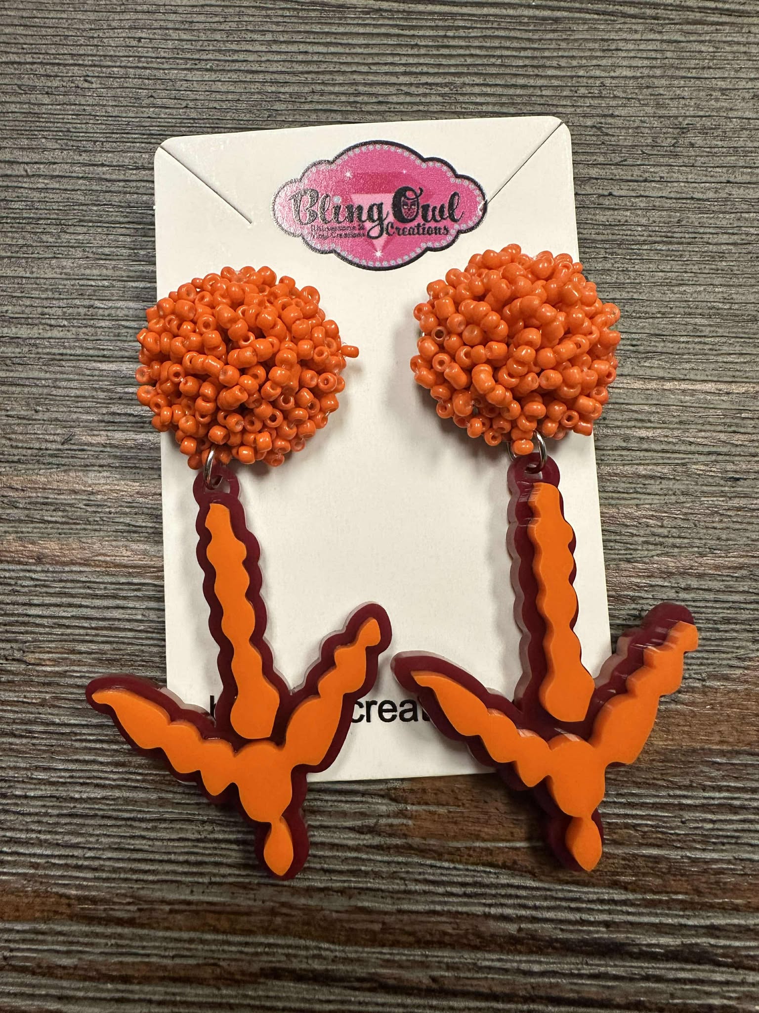 Acrylic sports dangle earrings for your Team. Choose between the Orange with Orange Toppers or Orange with Burgundy Toppers.