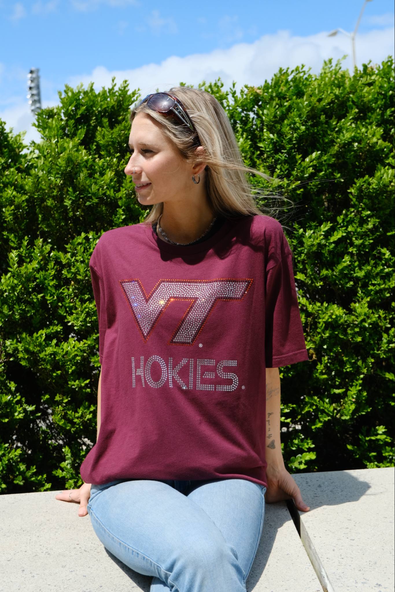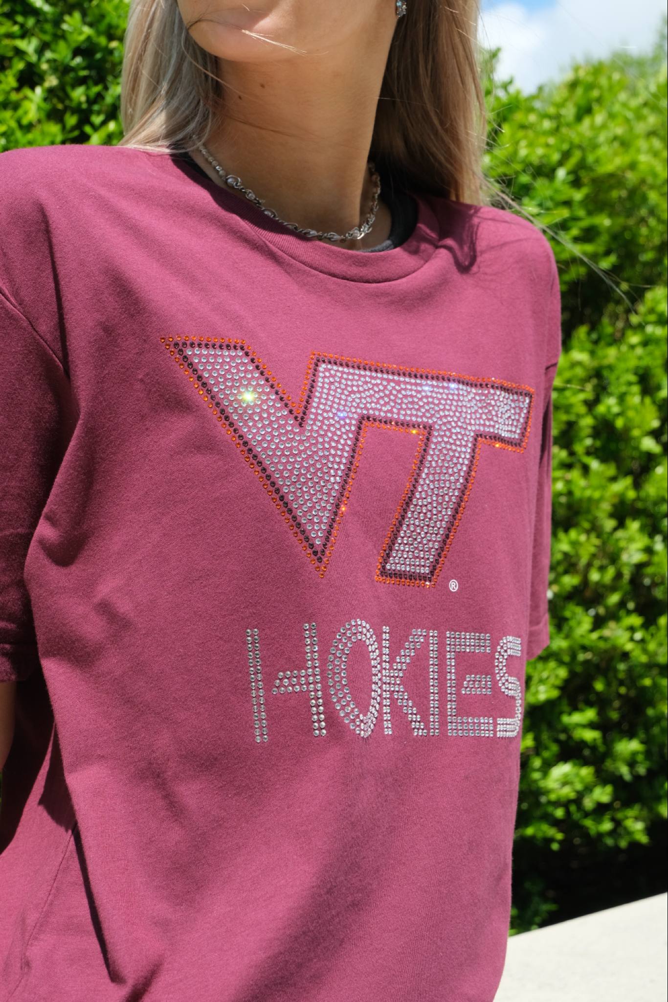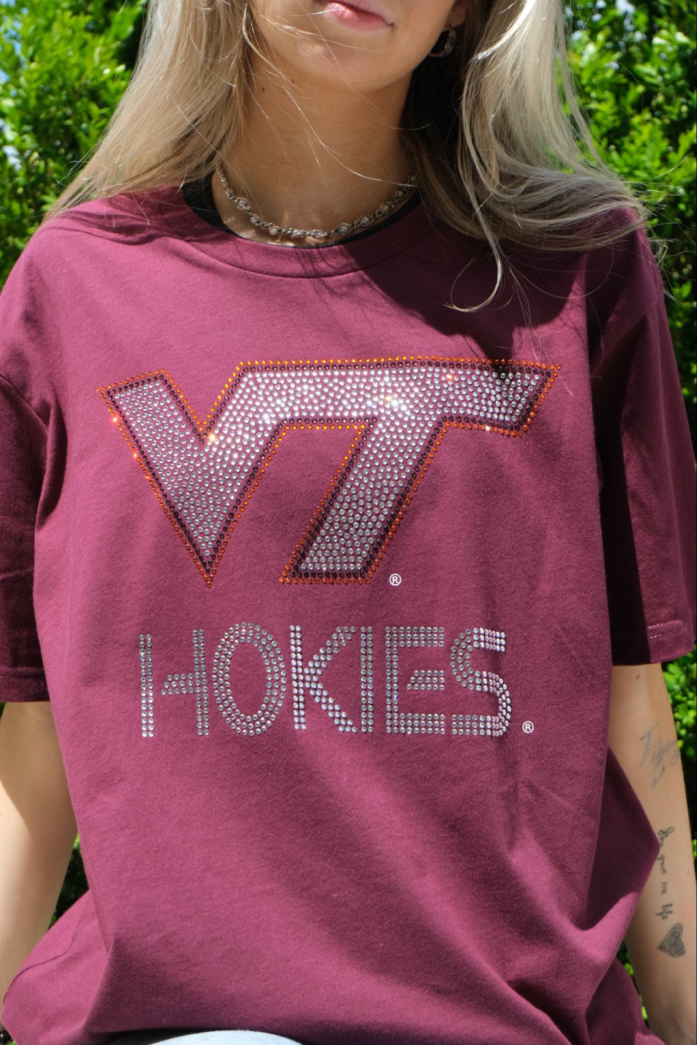 The front features the VT logo and “HOKIES” spelled out in gorgeous top-quality rhinestones – in three stunning colors to really make it pop! Whether you're headed to Lane Stadium, a tailgate, or just repping your team around town, this tee is a total must-have.