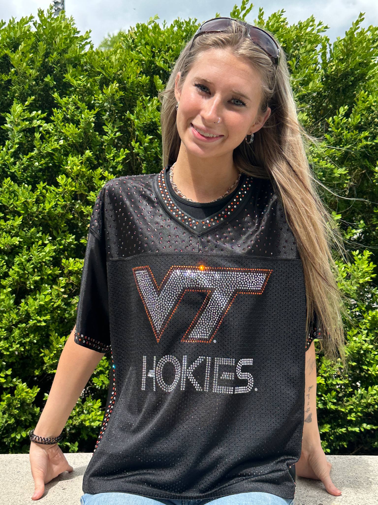 Whether you're cheering from the stands, tailgating, or showing school spirit on campus, this standout jersey is perfect for every proud Hokie. Each piece is hand-applied with care to ensure lasting sparkle and quality.