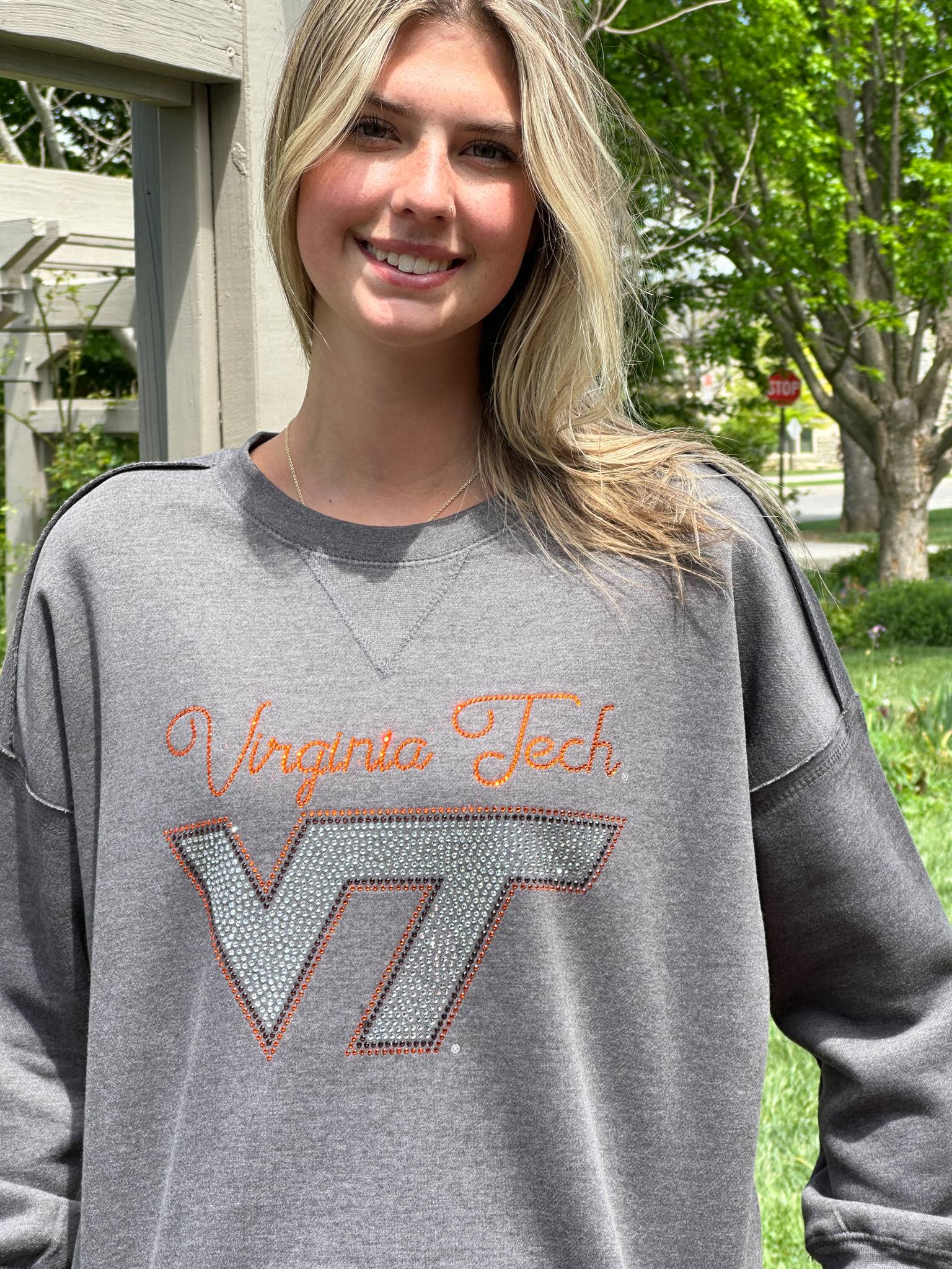 This isn't your average college sweatshirt—it's a sparkling statement piece made to turn heads! Stand out on campus, at the stadium, or around town. Our hand-placed rhinestones catch the light beautifully, giving you an elevated game day look with true Hokie spirit.